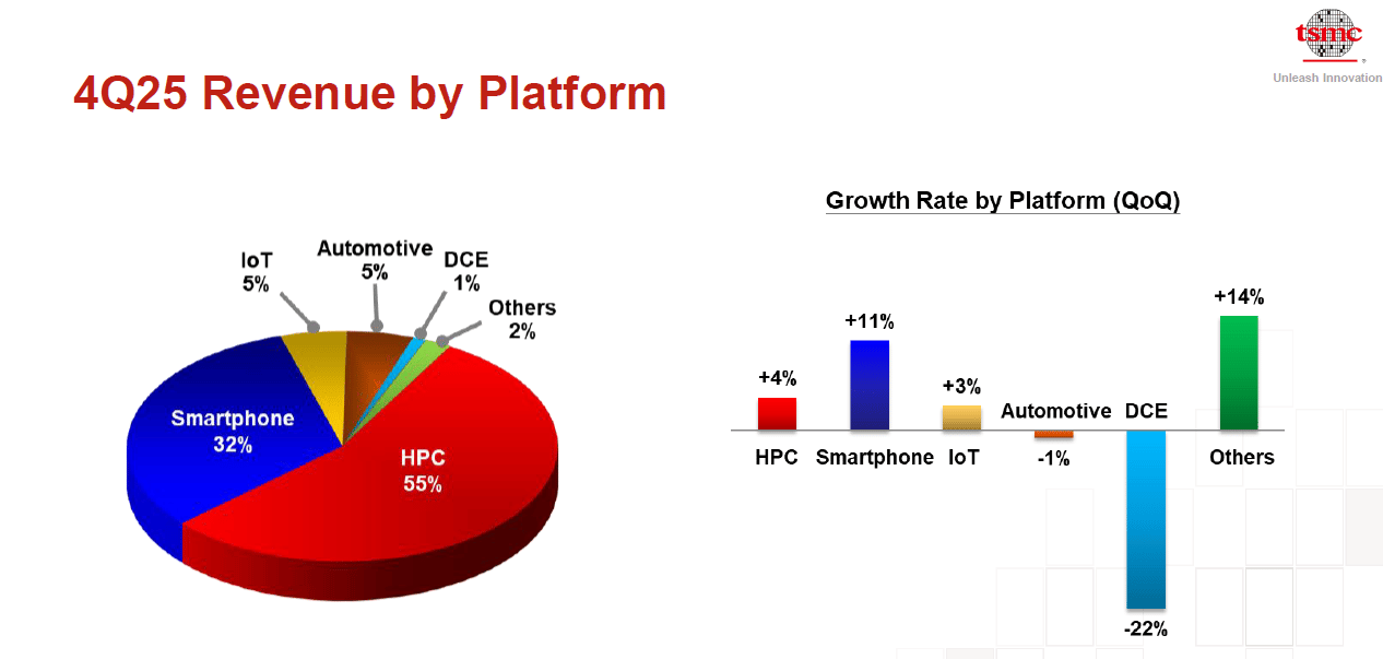 TSMC reports revenue by end market platform, and the mix has shifted sharply toward high performance computing (HPC). HPC, which includes data center CPUs, GPUs, AI accelerators, and gaming related chips, became the largest segment at about 53% of revenue in Q4 2024, while smartphones were about 35%. With AI infrastructure spending accelerating, HPC is expected to keep rising, with estimates that it could approach ~60% of revenue by mid 2025 as AI GPU and servers demand grows.
